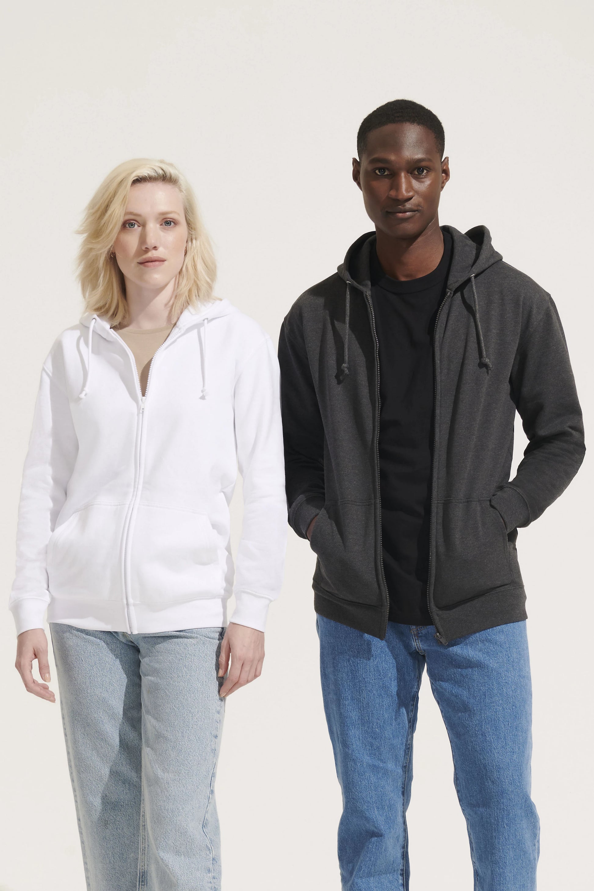 Confectionné en 80 % coton et 20 % polyester recyclé certifié GRS, ce modèle en fleece brossé 280 g/m² offre une douceur et une chaleur optimales. Il dispose d'une capuche doublée avec cordon ton sur ton, d'une fermeture éclair cachée, de poignets et bas en côtes 1x1, ainsi que d'une poche kangourou. Disponible en 6 coloris : blanc, noir, gris chiné, bleu royal, bleu marine et charbon chiné.